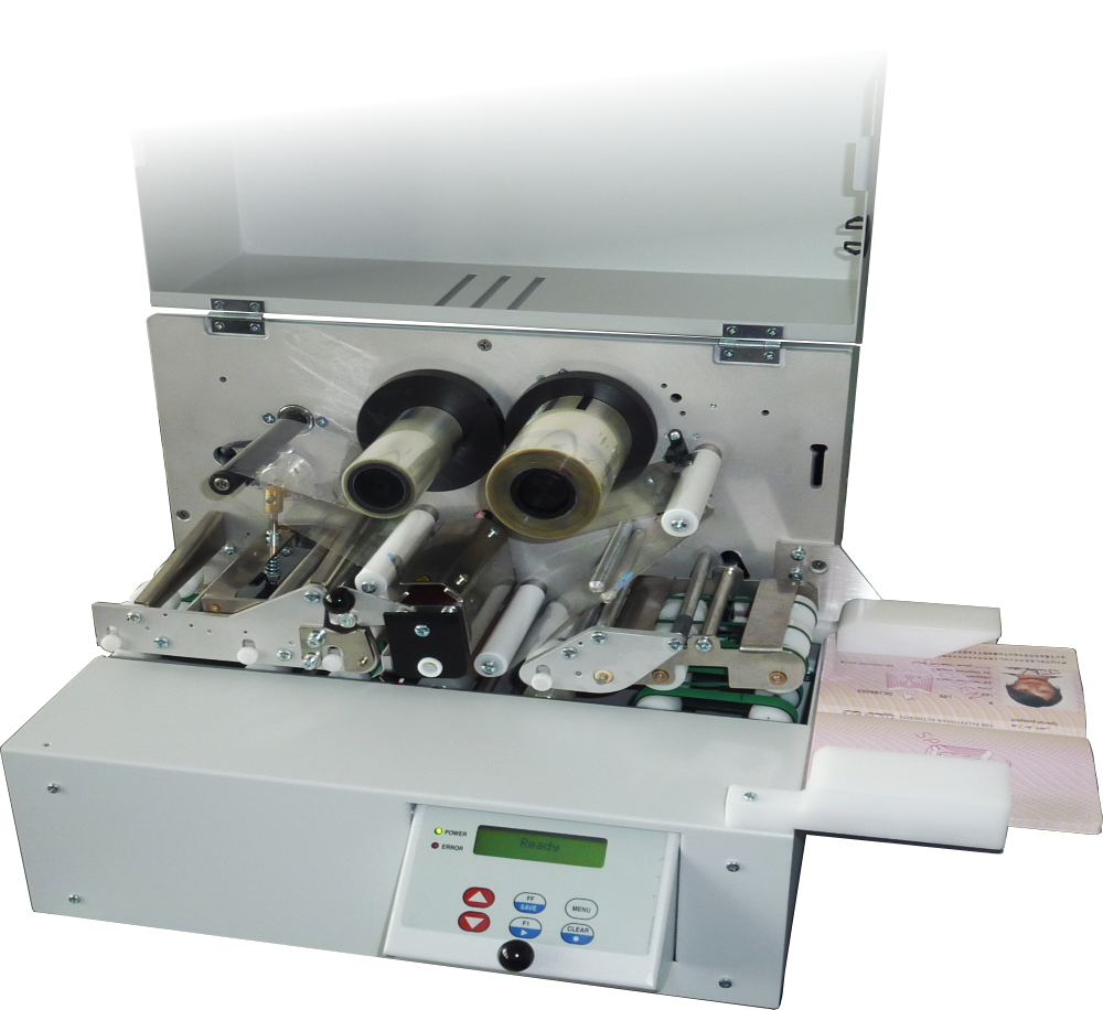 Laminates all pages of a passport, including the inside of the cover. Using a temperature- controlled heating roller, an extremely